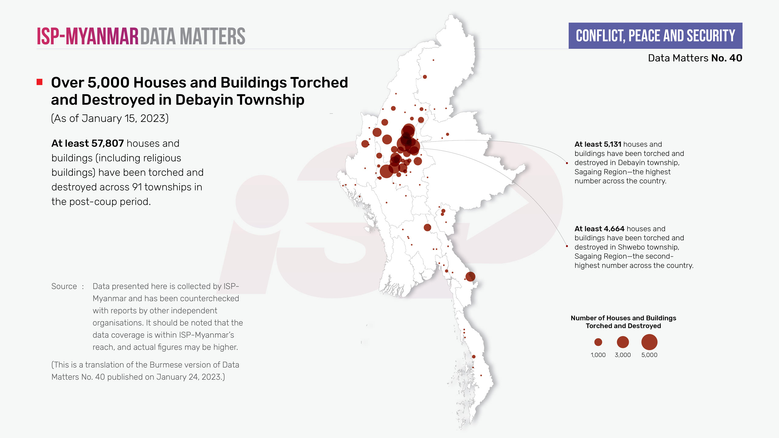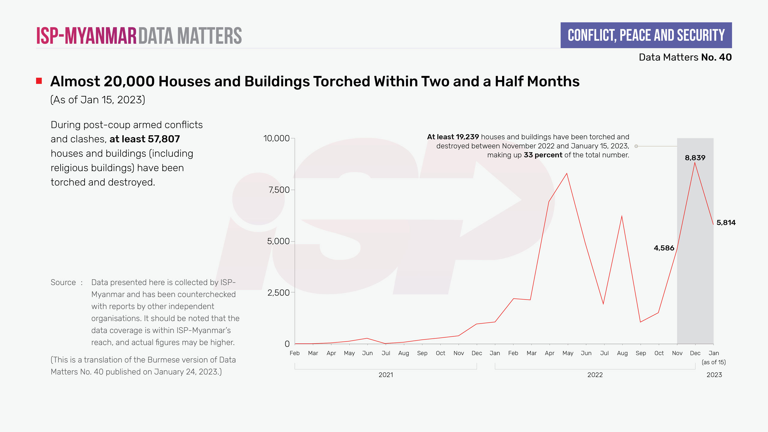 During post-coup armed conflicts and clashes, at least 57,807 houses and buildings (including religious buildings) have been torched and destroyed as of January 15, 2023. Between November 2022 and mid-January 2023 alone, at least 19,239 houses and buildings were torched and destroyed. Moreover, at least 673 houses and buildings have been torched and destroyed in 10 townships that had previously experienced no acts of arson. Among them, Myingyan township, Sagaing Region experienced the largest amount of destruction with over 300 houses and buildings torched and destroyed.