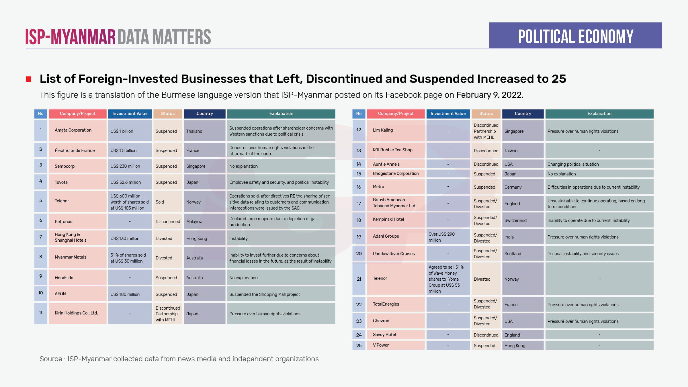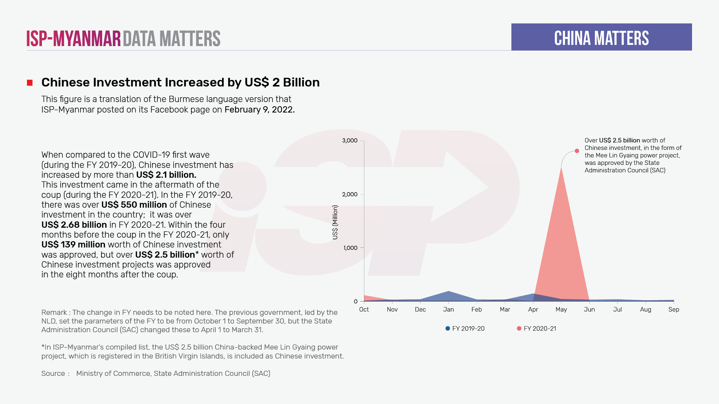 Foreign investment is an important economic pillar for developing countries, but not all kinds of foreign investment guarantee economic growth. If the investments are resource-exploitative, inconsiderate of the environment, inconsiderate of human rights, and do not improve the livelihoods of the local people, they could further deteriorate the development of the country and cause further impoverishment and vulnerability among Myanmar people. This has been the case throughout successive military regimes in Myanmar. The information concerning which countries are currently investing in Myanmar and what kind of investments are entering the market is key to understanding the involvement of other countries in the current political crisis. Moreover, foreign investments have a direct impact on the long-term sustainable development of the country and the livelihoods of Myanmar people, so it is crucial to monitor any foreign investment developments. Particularly in the current situation in which information ecosystems are being corrupted and destroyed, it is important to keep track of the figures on foreign investment to check whether the military regime is being transparent in their reporting of investments they have approved.