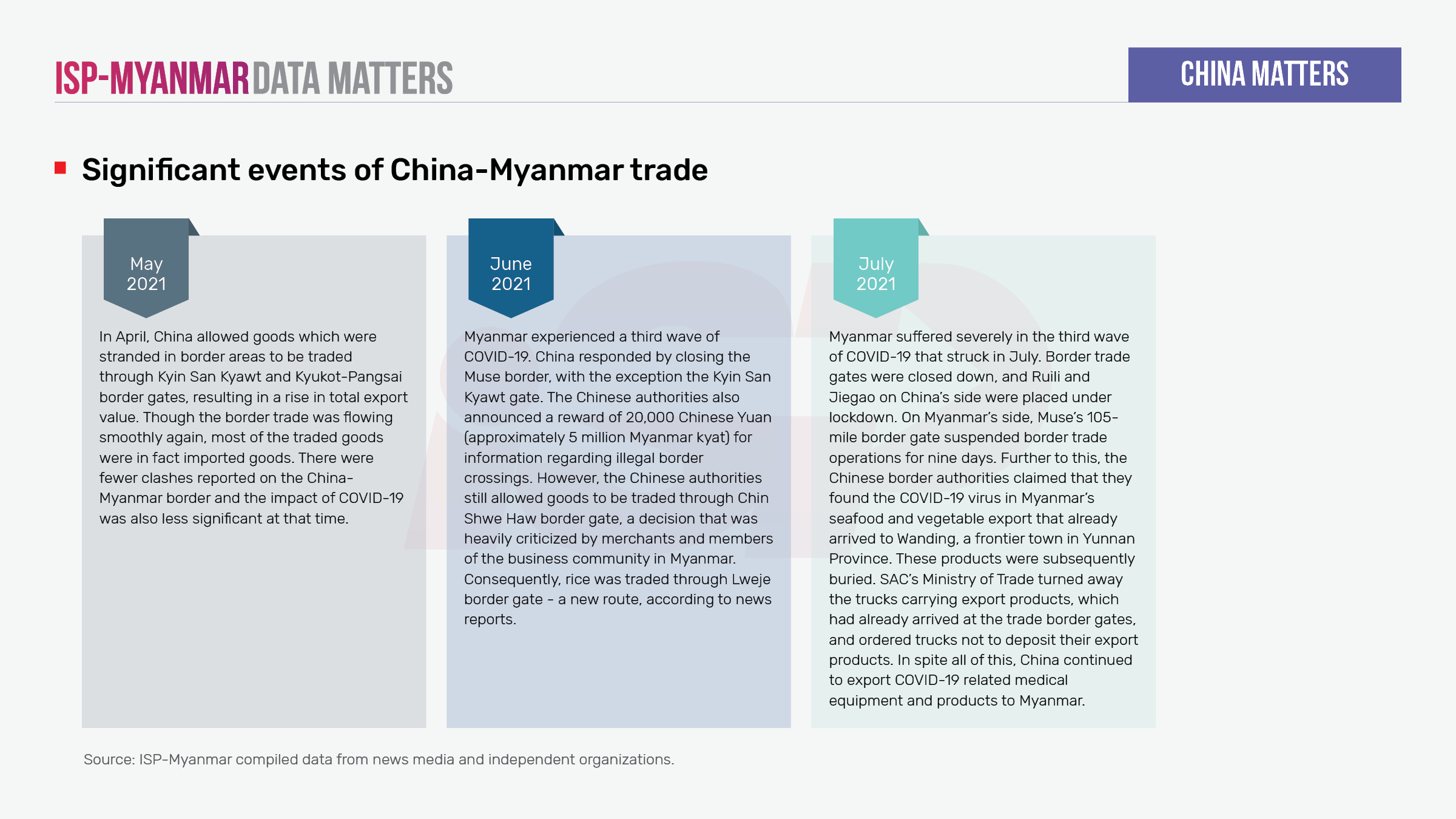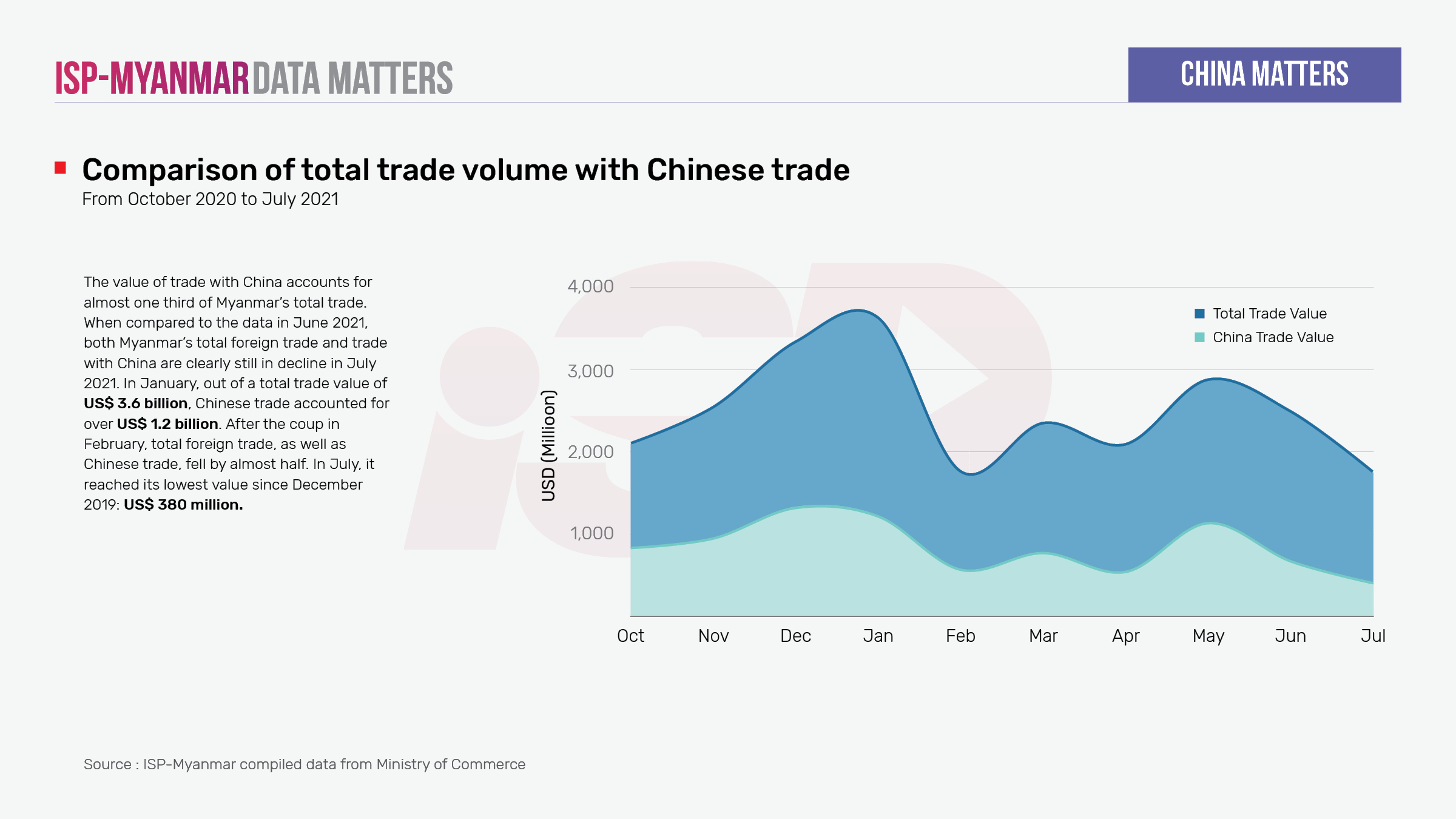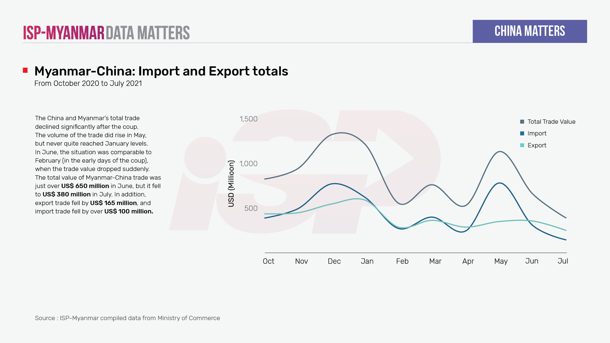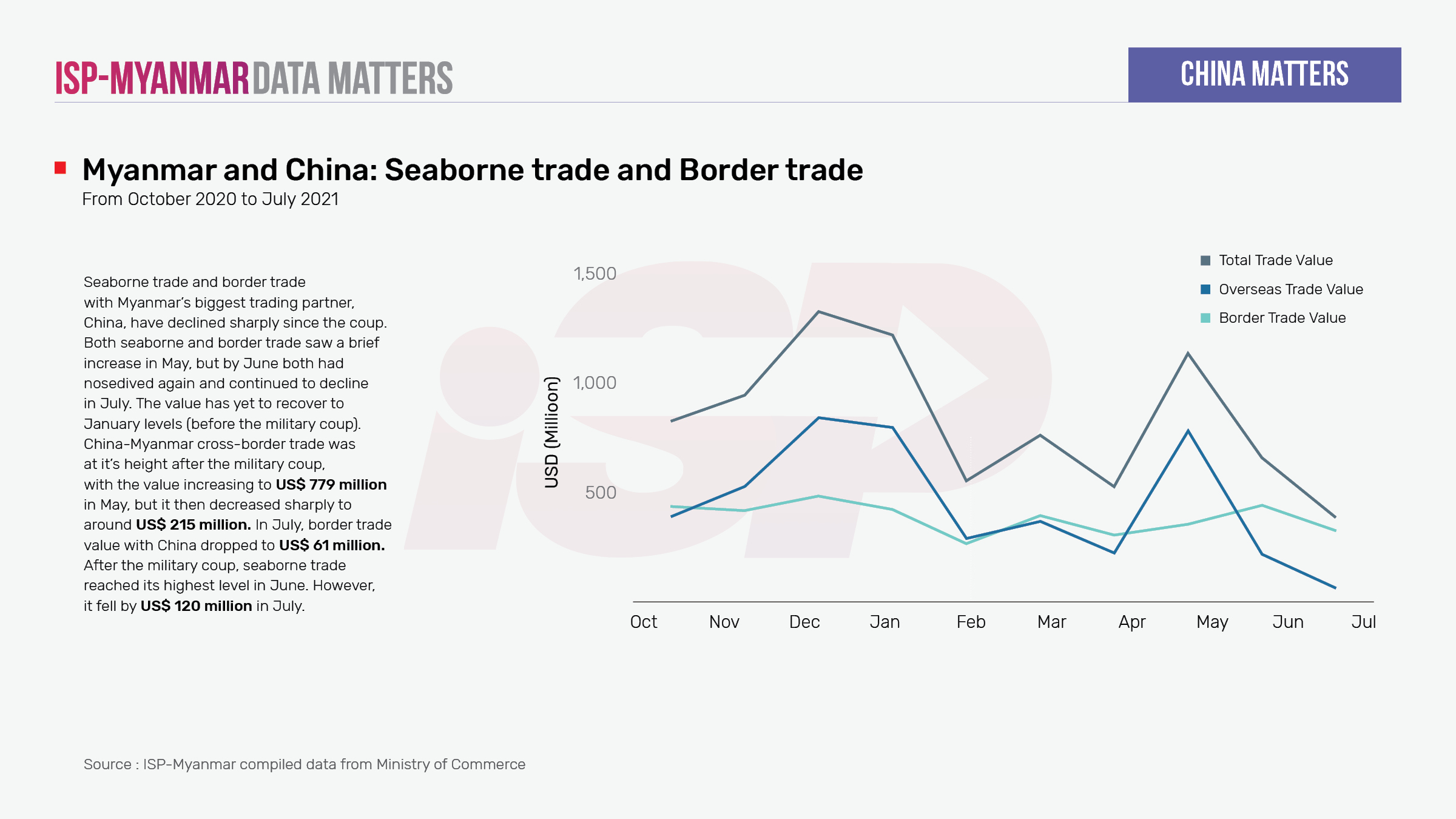 Trade between China and Myanmar trade has been in decline since the military coup . According to data published by the State Administration Council (SAC), the bilateral trade between Myanmar and China has dropped to US$ 380 million, the lowest value since December 2019. Border trade between the two countries has been declining since February and, in July, border trade reached sank to its lowest level since the coup.