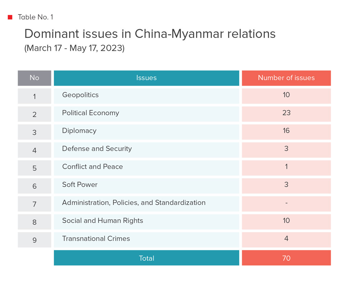 An analysis of ISP-Myanmar’s timelines on China-Myanmar relations from March 17 to May 17, reveals a total of seventy significant issues documented (See Table No. 1), with the dominant subjects being political economy, diplomacy, geopolitics, as well as social and human rights. In this ISP Explainer No. 2, ISP-Myanmar will provide a concise overview of these five pivotal issues.
