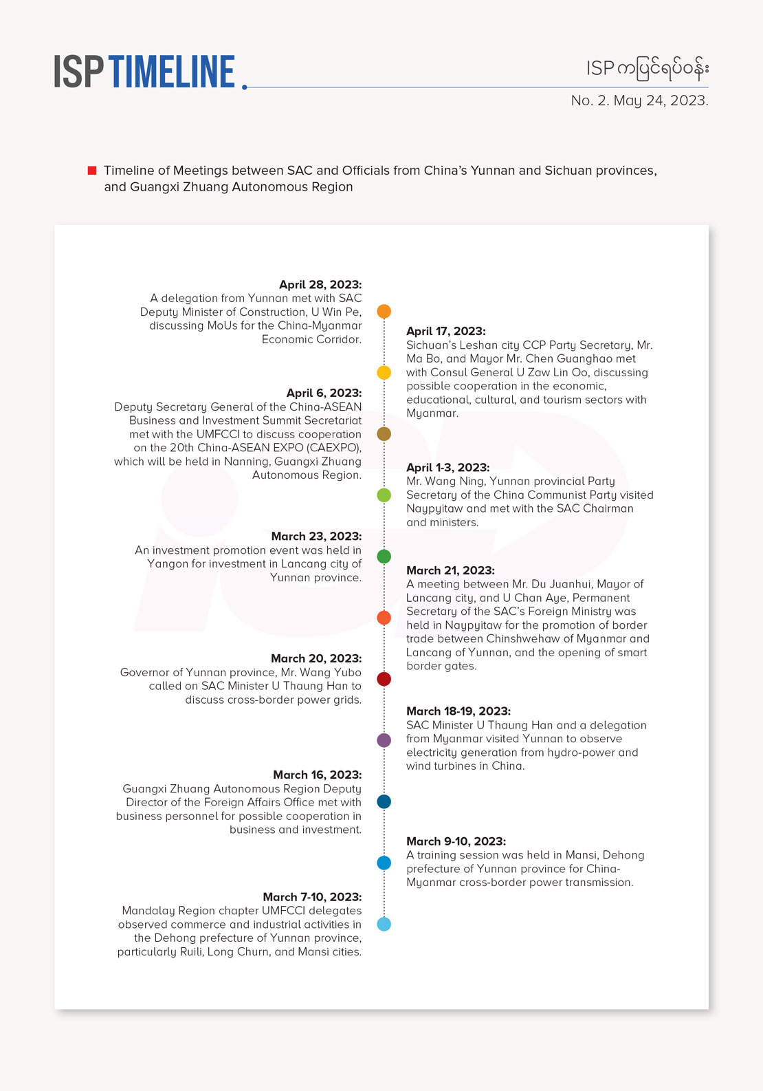 Following two significant meetings in China, certain Chinese officials started exploring the possibility of elections proposed by the SAC. In the first week of April, Mr. Wang Ning, a Member of the CCP Central Committee and Secretary of the CCP Yunnan Provincial Committee, visited Naypyitaw and discussed the strengthening of economic cooperation. Mr. Wang Ning met with the SAC Chairman and signed five MoUs with U Ko Ko Hlaing, SAC Minister of International Cooperation. The discussions between Mr. Wang Ning and the SAC Chairman revolved around ensuring stability along the border shared by the two countries, establishing direct flights between Yunnan and Myanmar, and fostering closer cooperation between Yunnan and Myanmar (See ISP Explainer No. 1, China’s new approaches through Yunan).