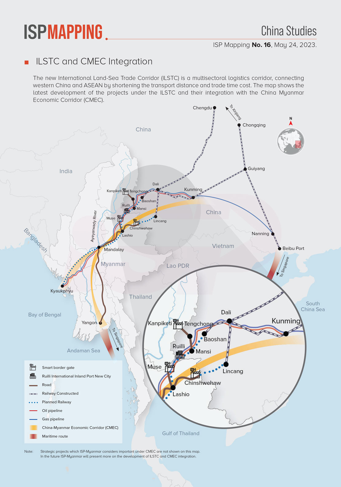 To speed up development of the new ILSTC China is improving economic cooperation between Myanmar and China’s eight western provinces, autonomous regions, and municipalities. The new initiative is a multi-sectoral cooperation project, including trade, mining, the IT sector, investment, and electric cars. To this end, an economic delegation from Guangxi Zhuang Autonomous Region, led by a deputy director of the Foreign Affairs Office held a meeting with Myanmar’s Consul General in Nanning on March 16. Similarly, Mr. Ding Yuanlong, Deputy Secretary General of the China-ASEAN Business and Investment Summit Secretariat met with Myanmar’s Consul General in Nanning on May 8. The parties discussed the promotion of trade in agricultural and fishery products between Guangxi Zhuang Autonomous Region and Myanmar, the building of the China- Myanmar Innovation Demonstration Park, and cooperation in the 20th China-ASEAN EXPO (CAEXPO). A new maritime trade link from Guangxi Zhuang Autonomous Region’s Beibu Gulf Port to Myanmar, one route under the ILSTC, was launched last year (See ISP Mapping No. 10: Three New China-Myanmar Cross-border Trade Routes). In addition, Chongqing provincial authorities held talks with the Union of Myanmar Federation of Chambers of Commerce and Industry (UMFCCI) on March 22, to discuss establishing direct flights between the cities of Yangon and Chongqing, investment in new energy vehicles (NEVs), cooperation in the production of agricultural machinery and in the health sector. Both the CCP Party Secretary and Mayor of Leshan city held discussions with Consul General U Zaw Lin Oo on possible cooperation in the economic, education, cultural, and tourism sectors in Myanmar.