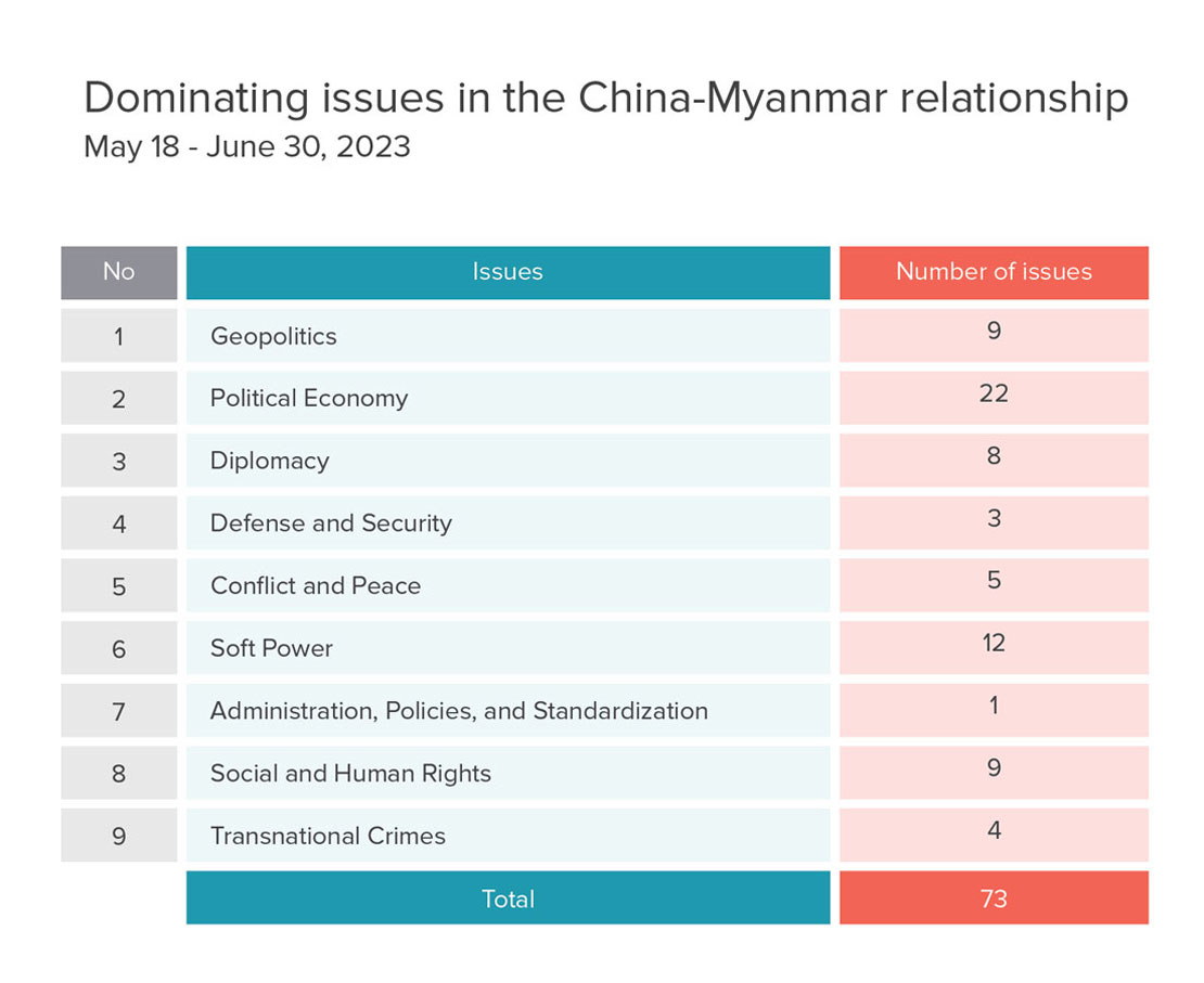 When analyzing ISP-Myanmar’s timelines of data collected on China-Myanmar relations, from May 18 to June 30, 2023, a total of 73 significant issues were documented (See the table). Of these, the categories of political economy, soft power, geopolitics, social and human rights have been the most prominent themes of the bilateral the relationship. This ISP Explainer then would like to discuss five crucial issues in brief.