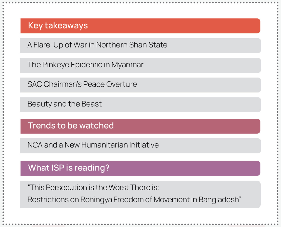 This week, ISP-Myanmar’s Insight Email focuses on three main topics: first, the resurgence of war in Northern Shan State, including in the Palaung area, second, the unproductive peace overture of the SAC chief, and third, the possible trend of humanitarian aid to Myanmar conflict-affected population in a new form. In addition, the bulletin reports a spread of pinkeye infections in Myanmar, where the population is struggling under a frail health care system. Contrarily, Myanmar fans have spent large amounts of US dollars to vote for a candidate for the Miss Grand International pageant while many are stressed from hunger, war, and scarcity. This could be fulfilling a psychological need of the Myanmar population: their hunger for a shared and collective pride in their society. Last, but not least, this bulletin briefly introduces a report on the Rohingya youth, a situation encountered in the Bangladeshi camps.