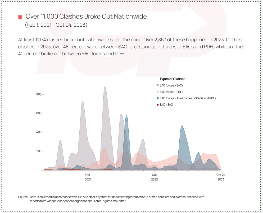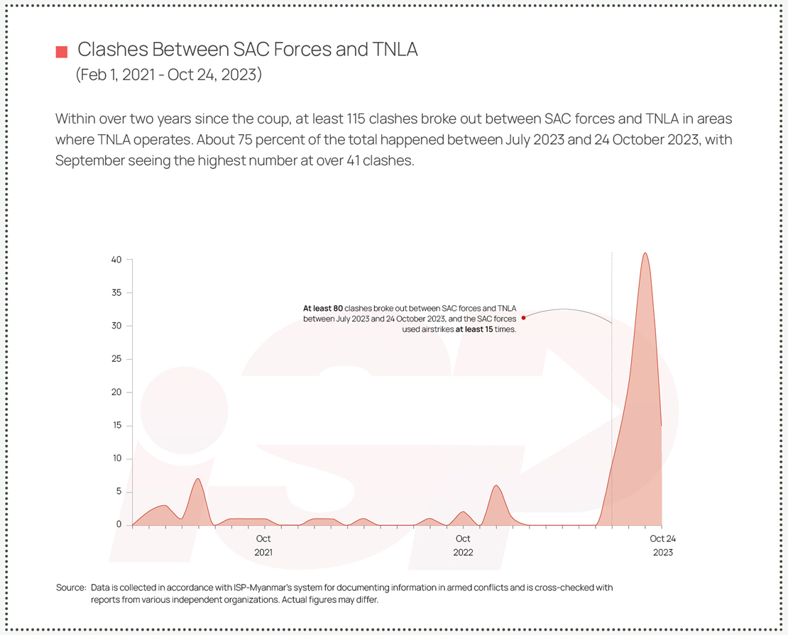 According to ISP-Myanmar data, from July 11 to October 24, at least 80 clashes occurred between the SAC forces and the TNLA in Muse, Lashio, Kuikai, Kyaukme townships of Shan State and Mogok Township of Mandalay Region, including at least fifteen air attacks. The junta air force has mounted at least 40 attacks, including bombing with lethal 500-pound bombs. The TNLA stated in a press release that the junta has shelled more than 400 times.