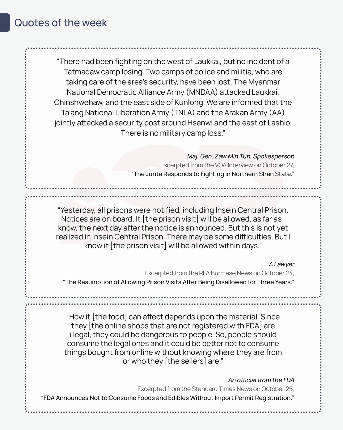 The SAC is concurrently engaging in war on all fronts with the TNLA, the Kachin Independence Army (KIA), and the Myanmar National Democratic Alliance Army (MNDAA) in the northern parts of Shan and Kachin states. On the morning of October 27, three Northern Brotherhood Alliance forces—the MNDAA, TNLA, and AA—jointly launched simultaneous attacks on Laukkai, Chinshwehaw, Lashio, Kutkai, Muse, and Namkham townships, under the name of Operation 1027. They stated that the military operation intends to destroy the junta, its allied militias, and online scam businesses in the areas. But it is hard to speculate about the results of this operation.