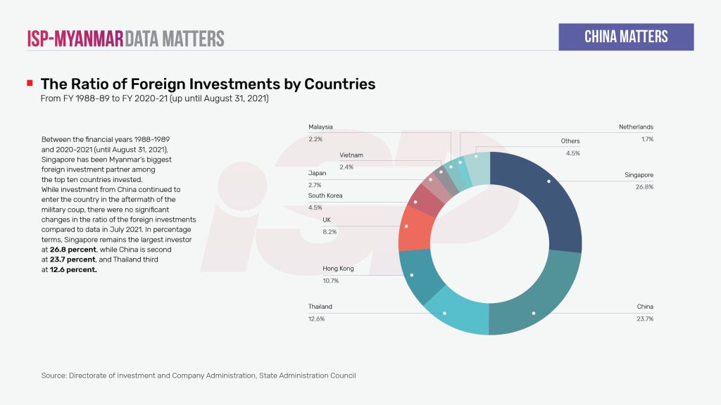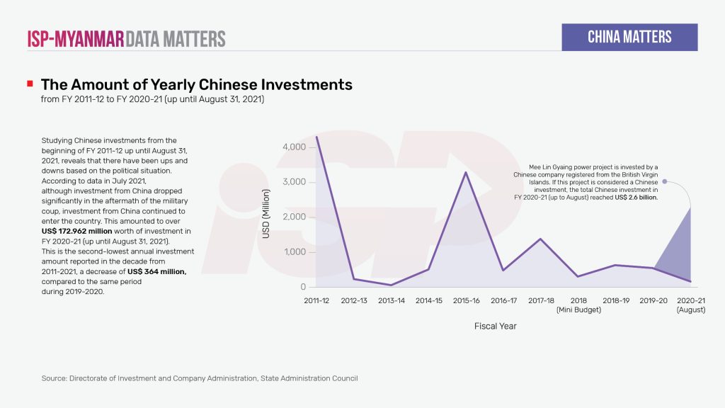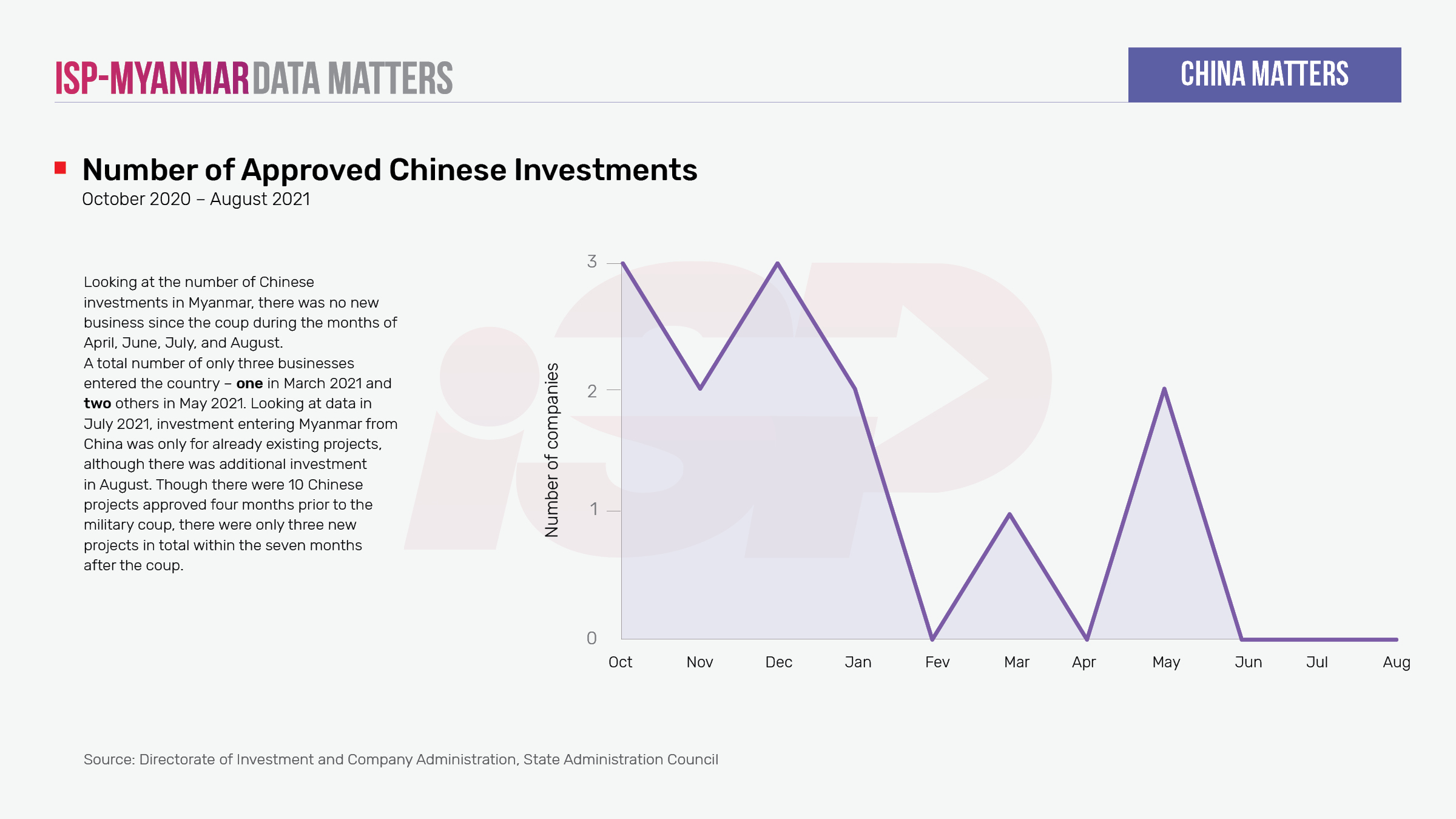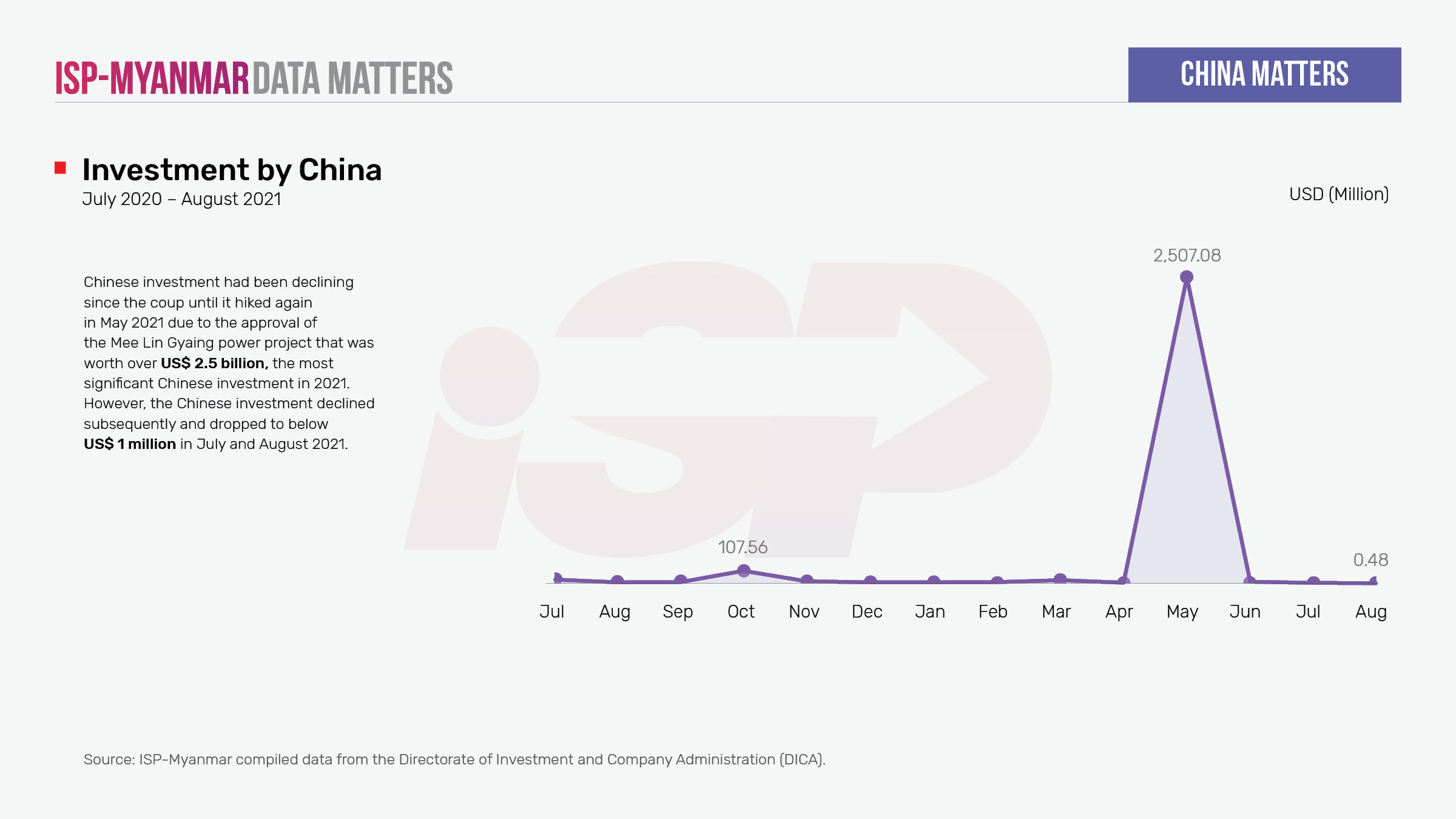 Investment from China in Myanmar declined significantly after the military coup by US$33 million – the lowest amount of investment by China since 2015. Compared to the same period in 2019-2020, the amount of investment decreased by US$364 million. The total amount of investment made by China entering the country in June, July, and August 2021 was only just over US$33 million. This investment within these three months is allocated as additional investment in previously existing projects.
