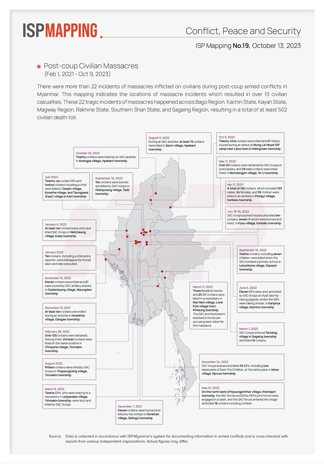 There were more than 22 incidents of massacres inflicted on civilians during post-coup armed conflicts in Myanmar. This mapping indicates the locations of massacre incidents which resulted in over 10 civilian casualties. These 22 tragic incidents of massacres happened across Bago Region, Kachin State, Kayah State, Magway Region, Rakhine State, Southern Shan State, and Sagaing Region, resulting in a total of at least 502 civilian death toll.