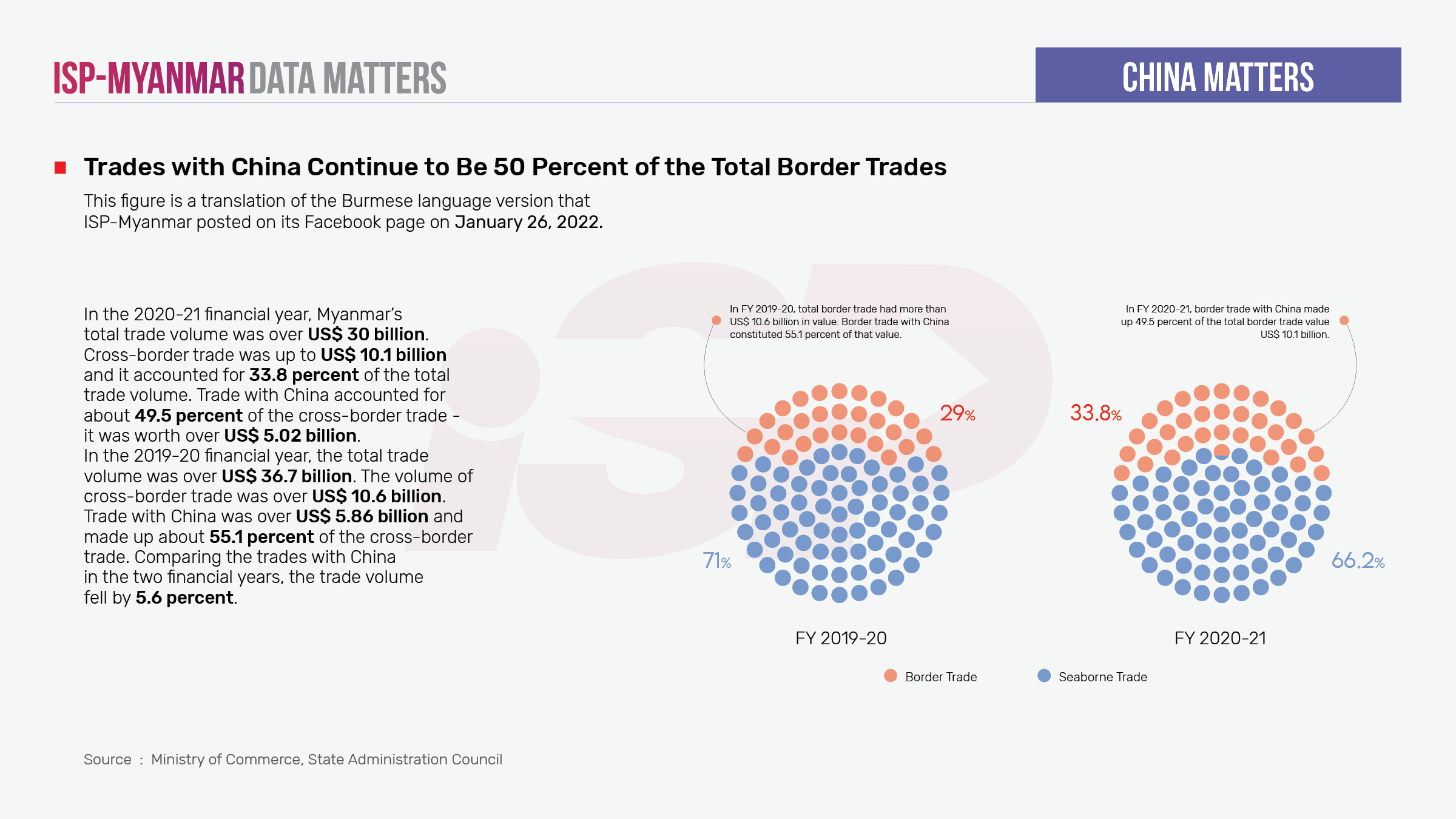 China’s closure of border trade gates with Myanmar during the third wave of COVID-19 set a new record low for China-Myanmar trade. Compared to the 2019-2020 financial year and the 2020-2021 financial year (provisional), the trade volume fell by more than US$ 837 million. Despite this, cross-border trade with China still constitutes around half of Myanmar’s total border trade, accounting for approximately 55.1 percent of total border trade in the 2019-2020 financial year, and 49.5 percent in the 2020-2021 financial year.