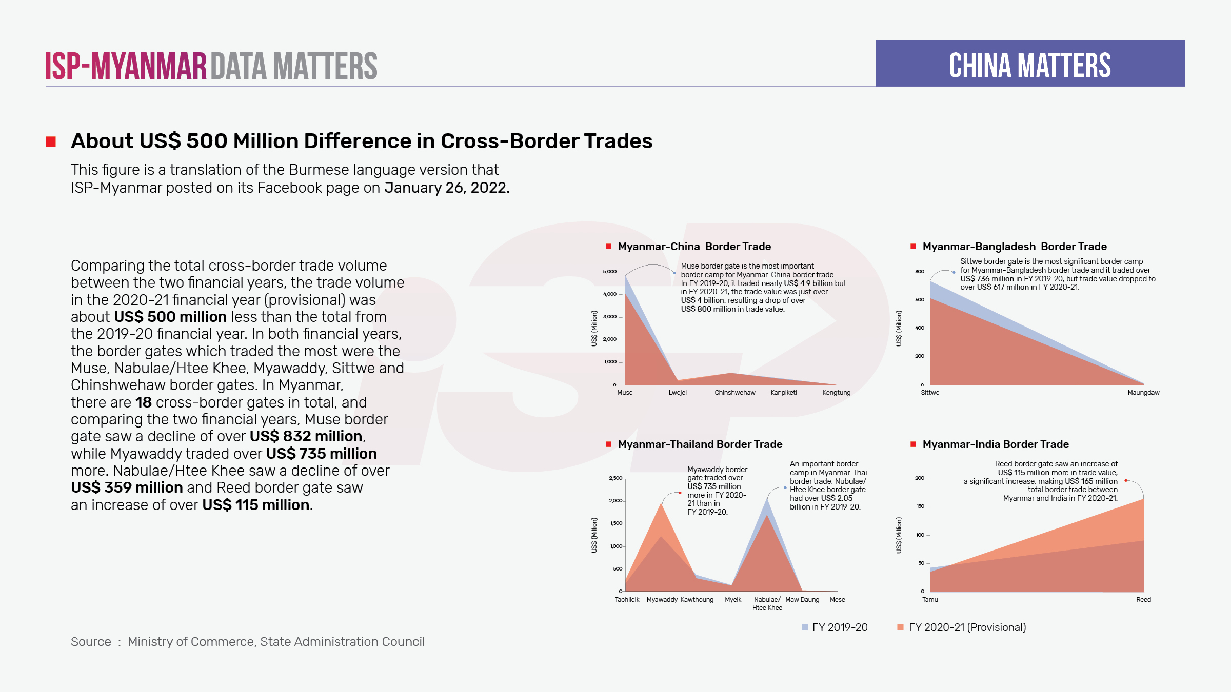 Of the six designated trade gates on the Myanmar-China border, four have reopened between November 2021 and January 2022. These gates were closed mainly due to COVID-19; this is the largest reopening since their closure.  However, restrictions continue to prolong the trade crisis.