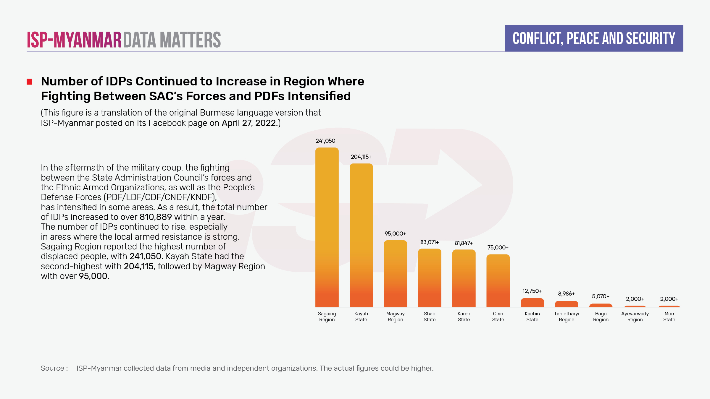 After the coup, the number of IDPs increased most rapidly in regions where fighting between SAC’s forces and Ethnic Armed Organizations (EAOs), and local People Defense Forces had intensified. The Sagaing Region has the highest number of IDPs – over 241,050 – followed by Kayah State which has recorded 204,115 IDPs. Within April, 2022 alone (as of April 25), the number of IDPs increased by at least 58,300.