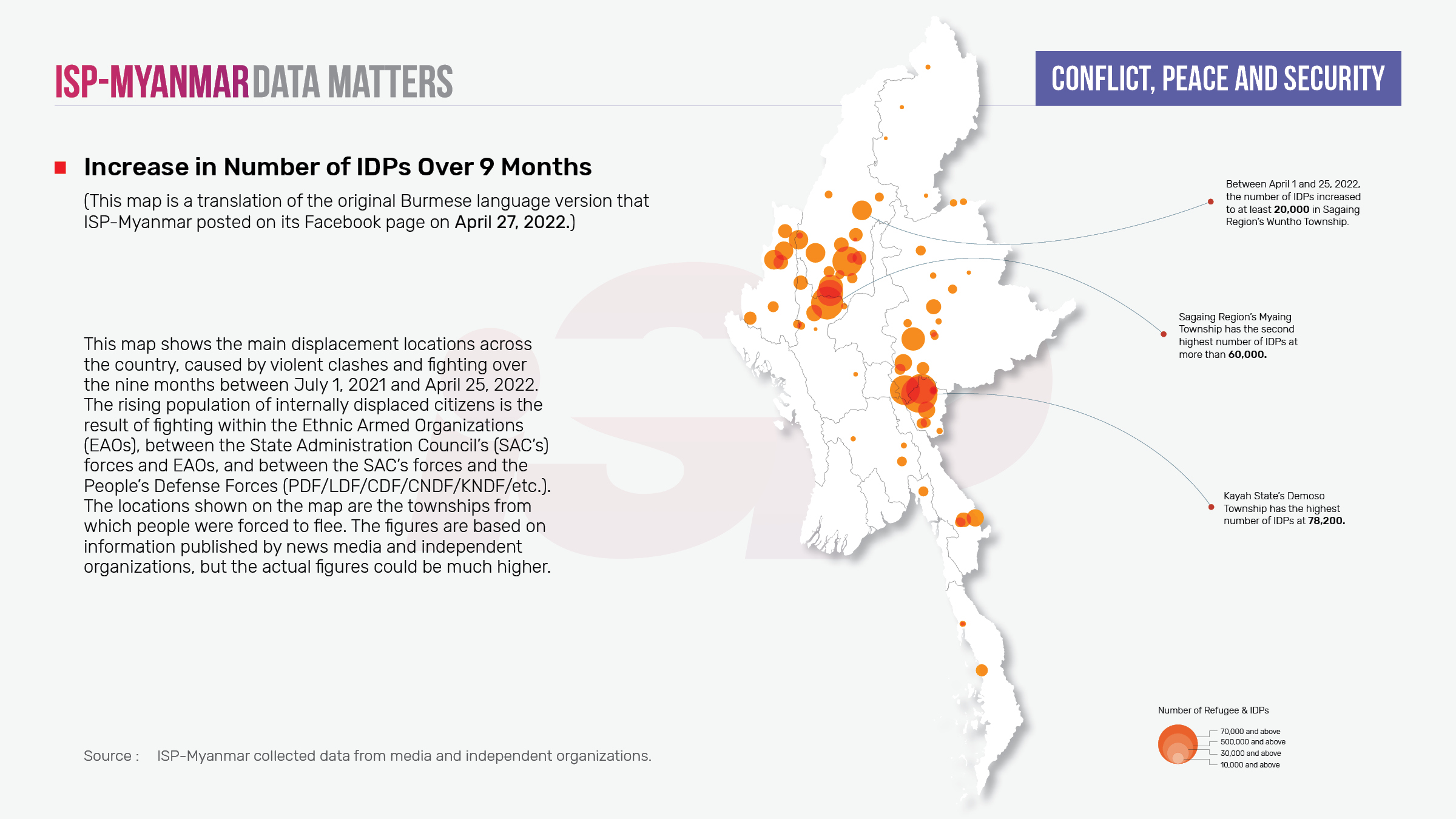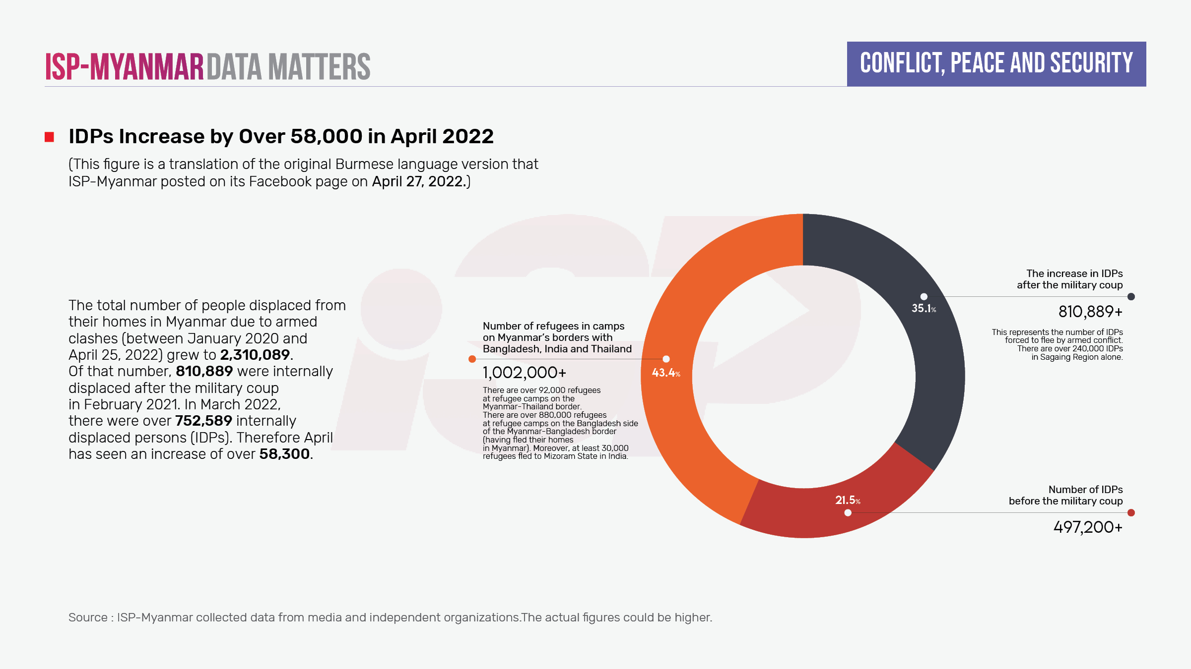 Since the military coup on February 1, 2021, through to April 25, 2022, battles and skirmishes across the country have resulted in a total of 810,889 Internally Displaced Persons (IDPs). There were already over 497,200 IDPs prior to the coup; the total number of people displaced from their homes in Myanmar has now grown to more than 1,308,089. Additionally, there are over 1,002,000 refugees living in camps at Myanmar’s borders with Bangladesh, India and Thailand.
