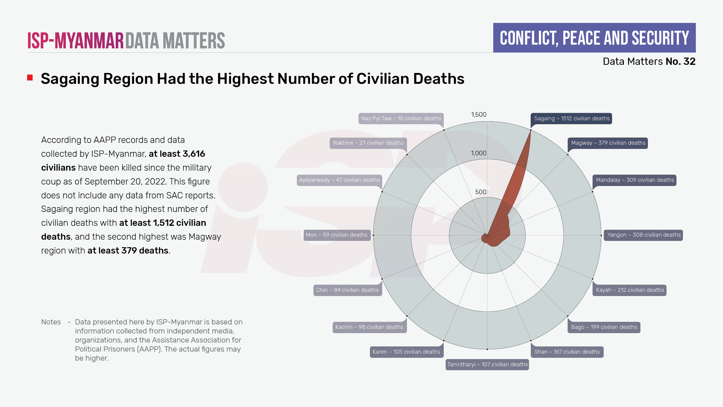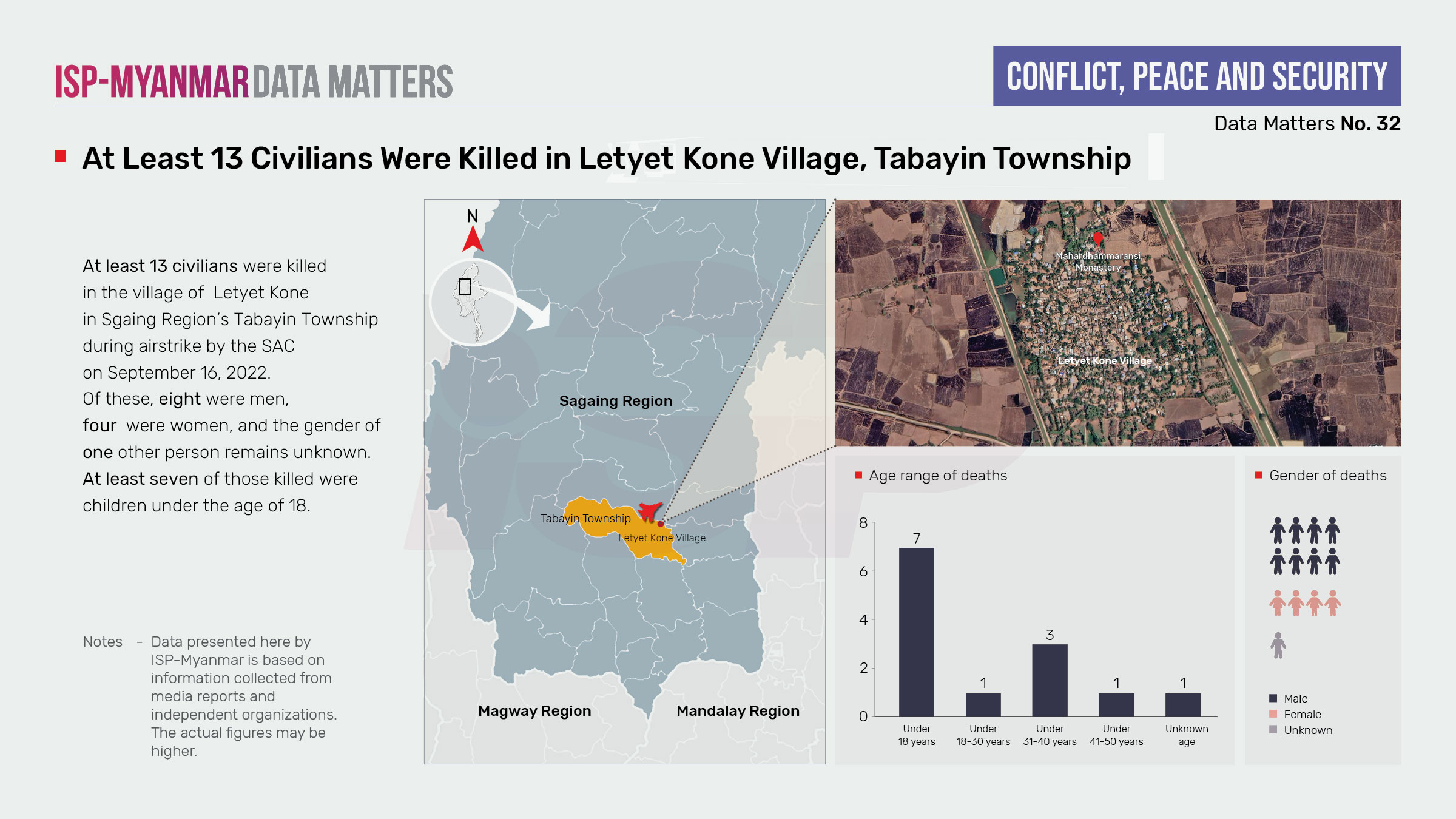 Civilian deaths have continued to rise. At least 13 people were killed in the village of Letyet Kone in Sagaing Division’s Tabayin Township during airstrikes by the SAC on September 16, 2022. Of these, eight were men, four were women, and the gender of one other remains unknown. At least seven of those killed were children under the age of 18.