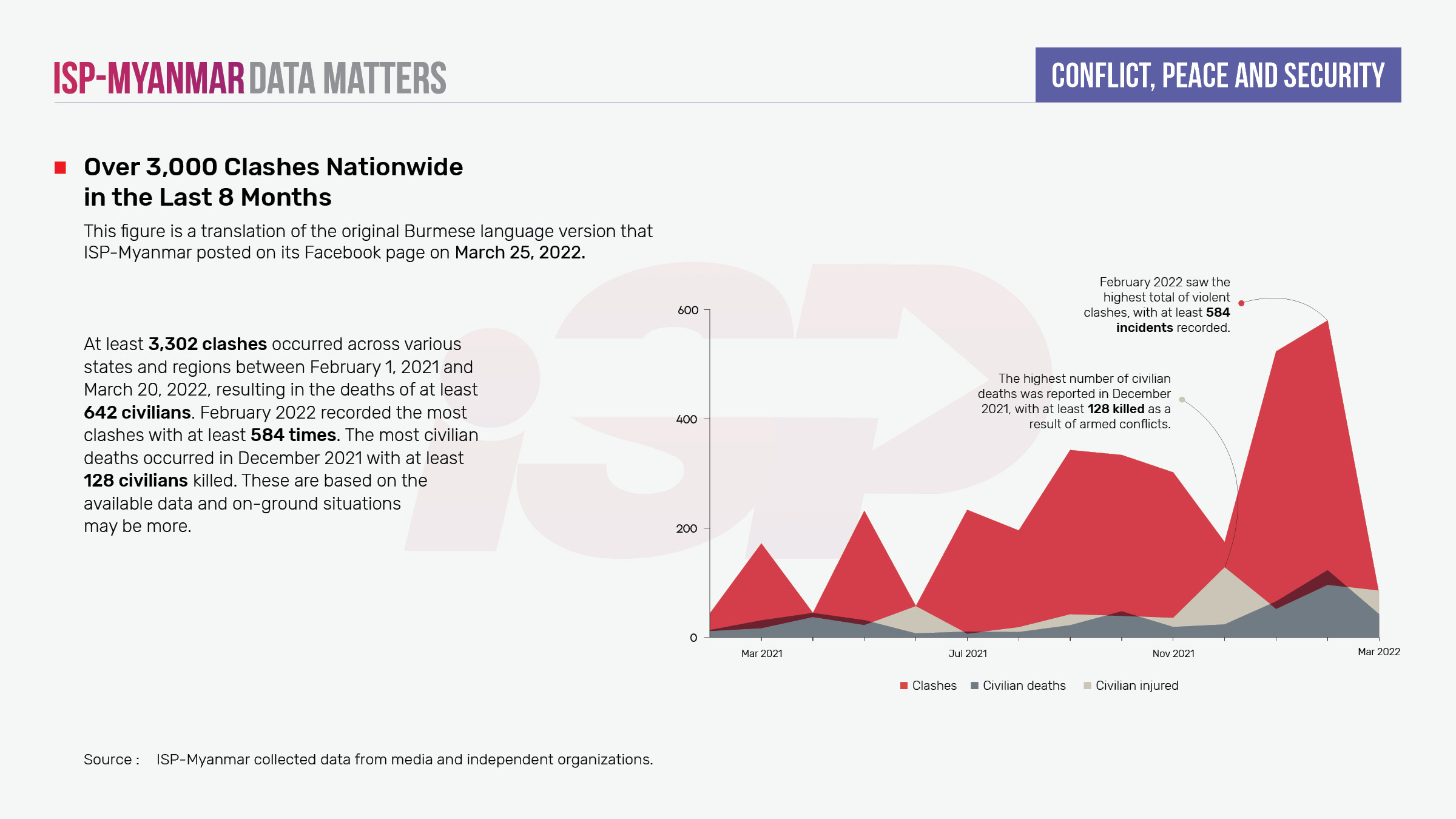 On-the-ground reports from ethnic news organizations and other independent media groups provide regular updates about conflict situations, their impact, and the collateral damage in the aftermath of the military coup. These include reports of renewed fighting in ethnic areas, civilian fatalities, and rising refugee and IDP issues on the ground. In addition, records and reports by United Nations organizations such as the United Nations Office for the Coordination of Humanitarian Affairs (UNOCHA), and other independent local and foreign organizations also provide information about the ongoing conflict situation in Myanmar.