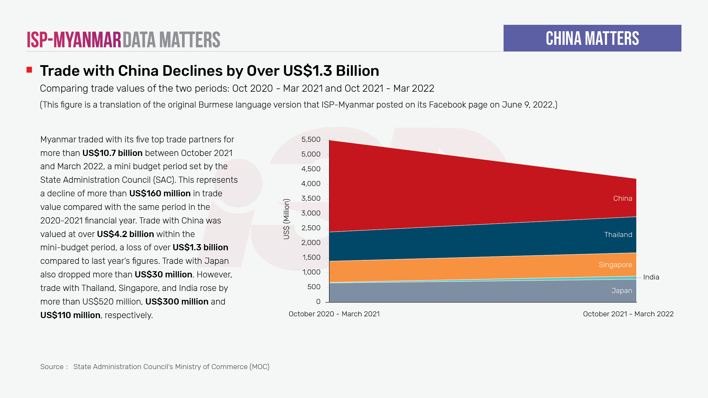 Myanmar’s foreign trade topped US$16 billion during the first mini-budget period set by the State Administration Council (SAC). Exports accounted for nearly US$8.3 billion, while imports added nearly US$8 billion. Overall trade value declined in this period over the previous financial year by more than US$160 million. Trade with China during this period brought in more than US$4.2 billion, a drop of more than US$1.3 billion for the same period last year.