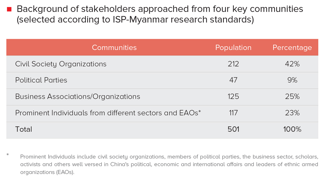 The table presents four communities involved in Sino-Myanmar relations. They are (1) Civil Society Organizations, (2) Political Parties, (3) Business Associations/Organizations and (4) Prominent Individuals, Scholars, Professionals, and Leaders of Ethnic Armed Organizations (EAOs), as well as influential people from social and religious organizations. To select the survey participants, the survey team considered the recommendations made by the key experts after consulting with them at least 20 times with 30 individuals from different sectors. These key experts made their recommendations based on the individual’s professional background, level of expertise in Sino-Myanmar relations, and level of engagement with China and their influence on Sino-Myanmar policy issues.